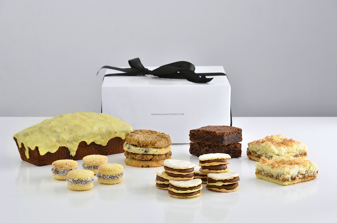 CAJA IDEAL PARA REGALAR; Trae 1 budin a eleccion, 6 rogelitos, 4 alfajores de maicena, 2 cuadrados de coco con dulce de leche, 2 cuadrados de brownie, 4 cookies.