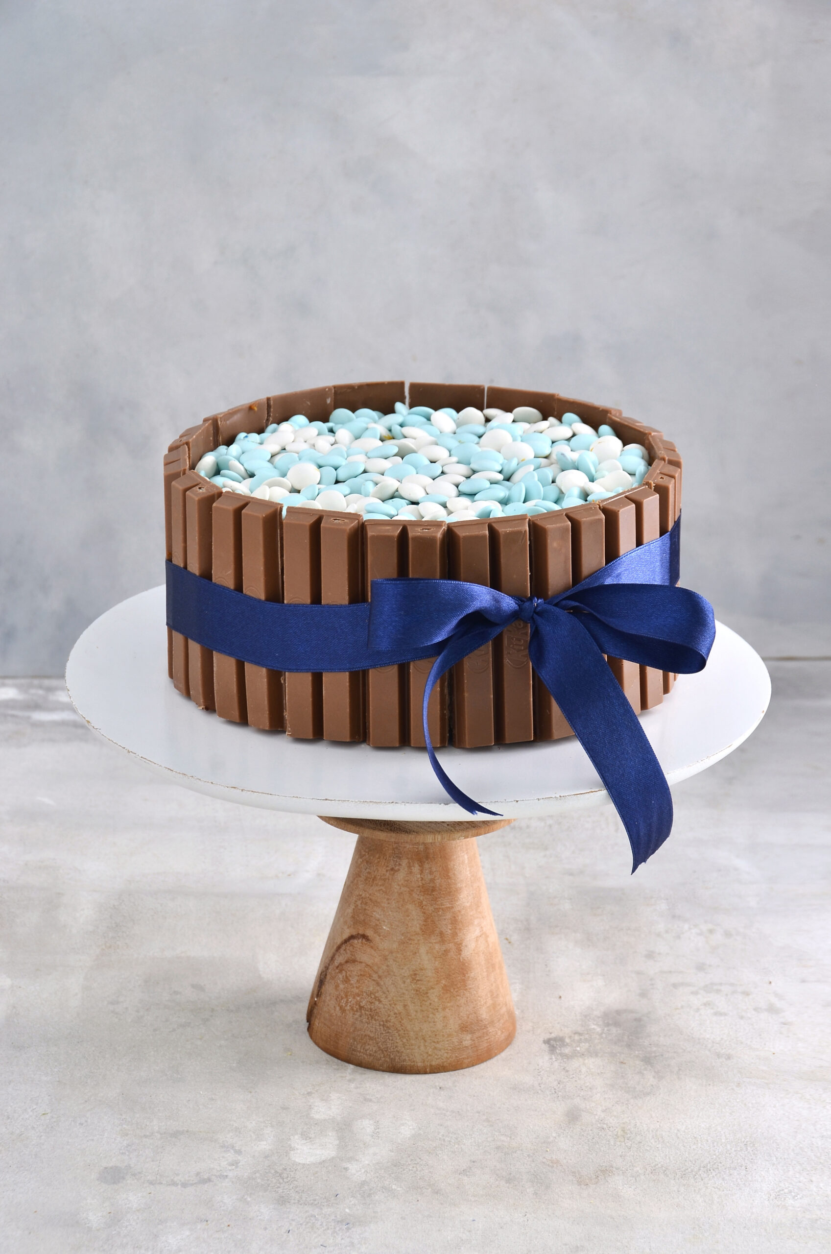 BISCUIT DE CHOCOLATE O VAINILLA RELLENO CON DULCE DE LECHE DECORADA CON CHOCOLATES KIT KAT Y CONFITES DE COLORES A ELECCION. CINTA COLOR ROSA O AZUL A ELECCION.