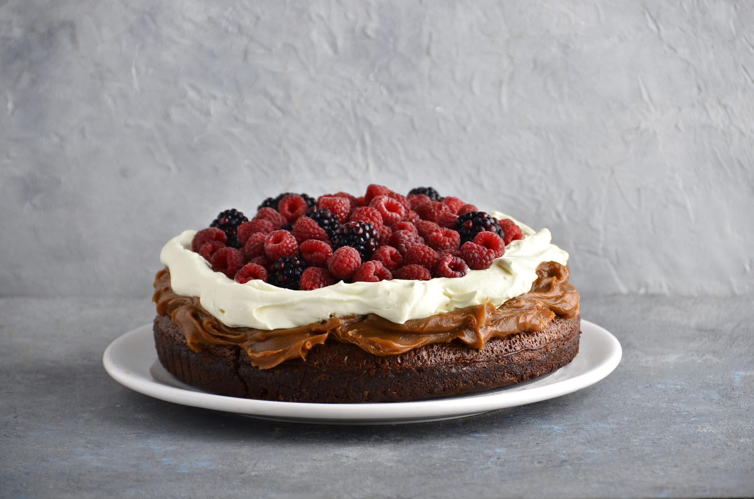 Base humeda de chocolate, dulce de leche, crema y frutos rojos.