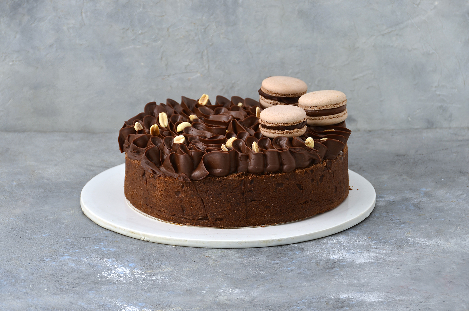 Base de masa sable de cacao relleno de caramel y mani, cobertura de chocolate, decorada con macarons de chocolate.